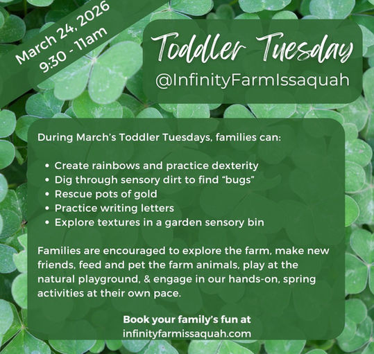 Want even more savings? Sign up for a Totally Tuesday membership, which enables you and your Littles to arrive at 9am and attend every Tuesday when your membership is active. You can even bring a friend and their little along in your car for Toddler Tuesday fun! Have questions about becoming a member? Email infinityfarmissaquah@gmail.com